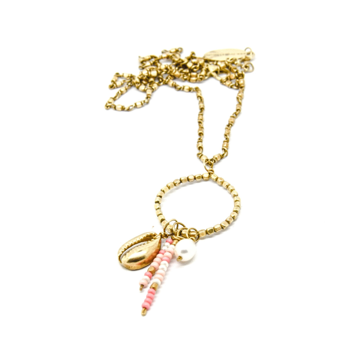 A beaded ring pendant hung with a cluster of charms comprising of a grade A fresh water pearl, brass cast cowrie shell and beaded pins.