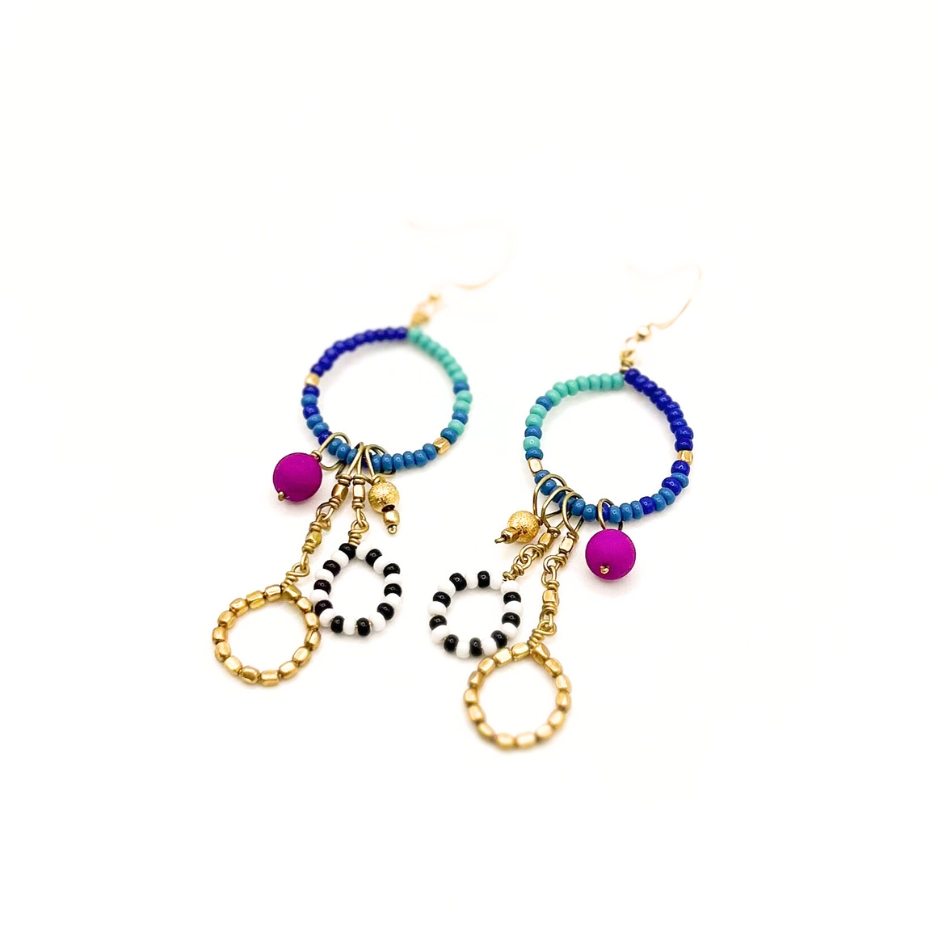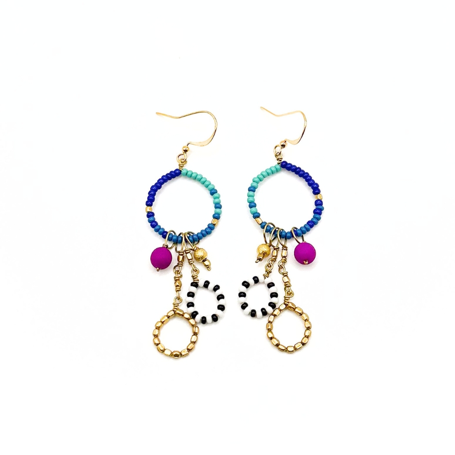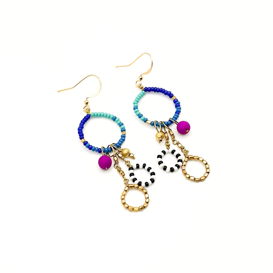 Blue beaded brass wire is carefully shaped into rings and hung with black and white with gold beaded circles and beads. Using traditional Maasai beading techniques and hung on gold plated hypo-allergenic earring hooks.