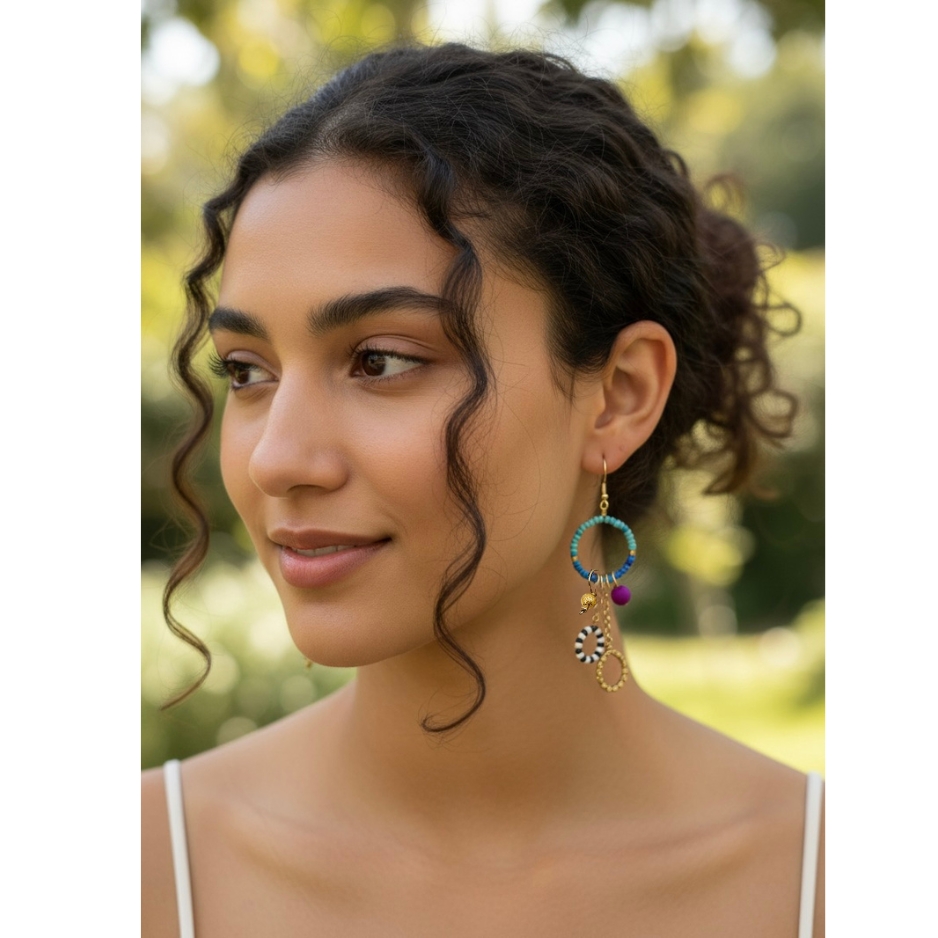 Vibrant and whimsical dangle charm drop beaded earrings inspired by the colours of the beautiful traditional robes worn by the Maasai women of the Loita Hills.