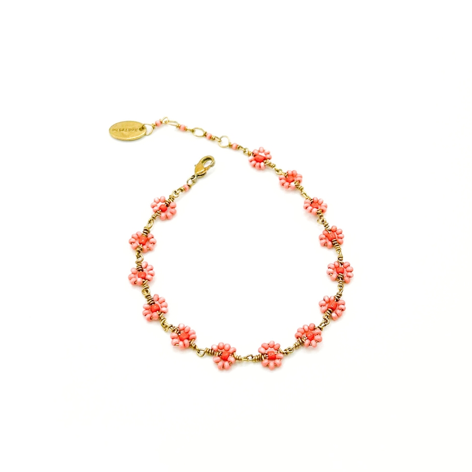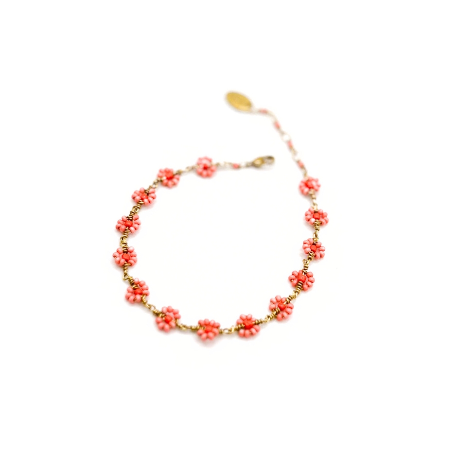 A chain of tiny coral and burnt orange beaded flowers make up this warm and vibrant bracelet. It is part of our Enchipai collection. Enchipai is the Maasai word for “joyful” and this necklace is just so fun and joyful!