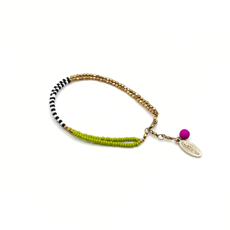 Created by carefully threading lime green, black, white and handmade brass seed beads and finished with a pop of pink – 6mm glass bead.