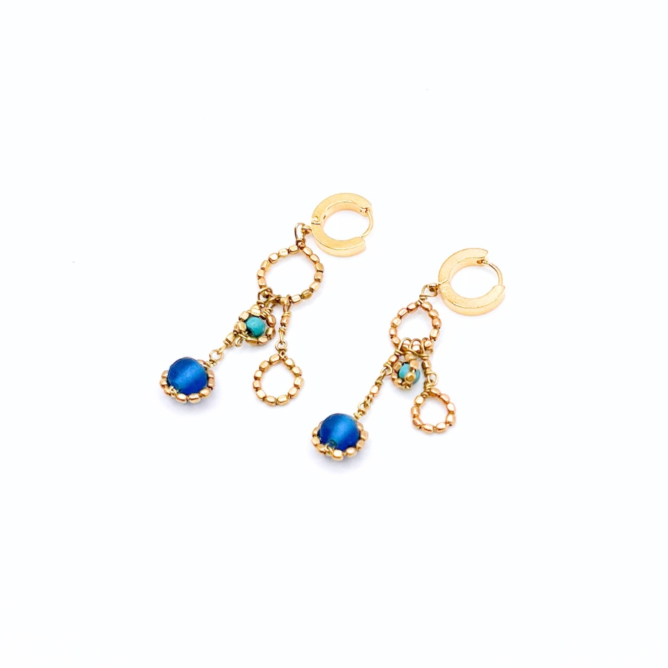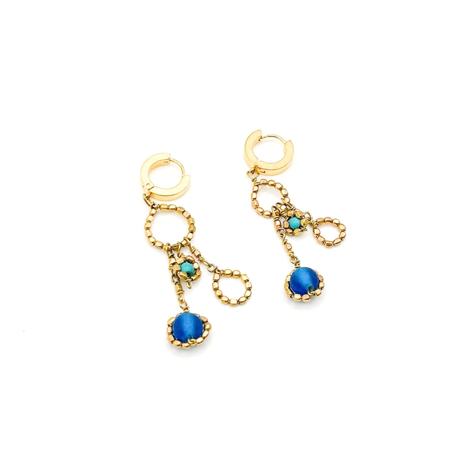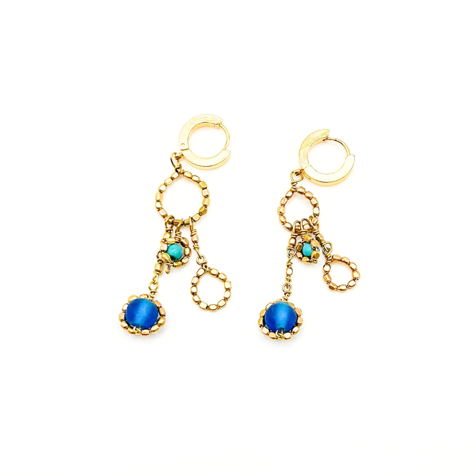 These elegant earrings were created using a stunning mix of turquoise and blue beads with handmade brass and stardust beads hung on gold plated huggie hoops.