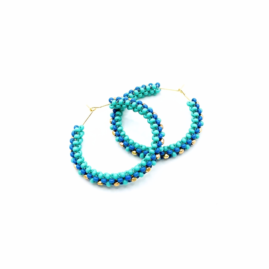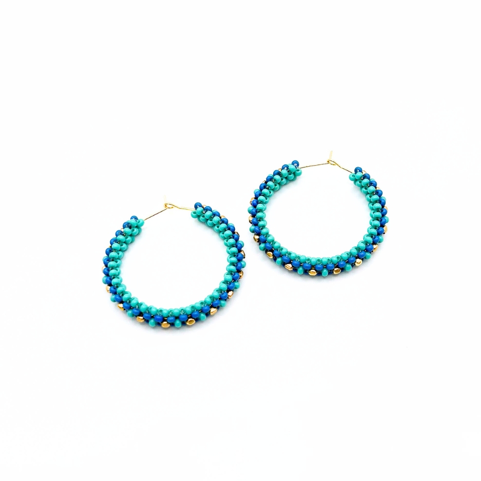 Stunning beaded hoop earrings created using a gorgeous mix of turquoise and blue glass beads with handmade brass beads woven onto gold plated hoops.